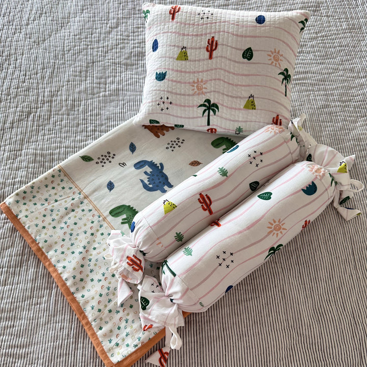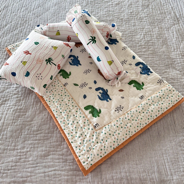 Ignite your baby’s imagination with this mini cot set featuring cute dinosaurs. Crafted from soft, high-quality fabric, it offers a snug fit for your cot, ensuring both style and comfort for restful sleep.