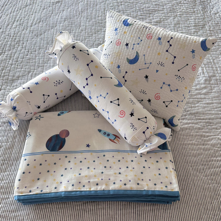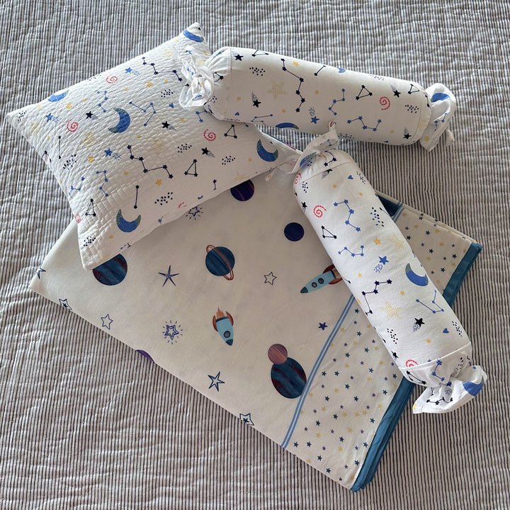 Ignite your baby’s imagination with this mini cot set featuring cute planet motifs. Crafted from soft, high-quality fabric, it offers a snug fit for your cot, ensuring both style and comfort for restful sleep.